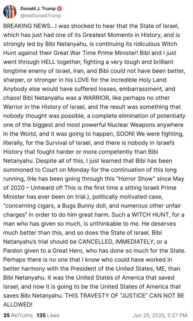 Truth Social, 25 ביוני 2025, 18:27 (שעון מזרח ארה”ב)